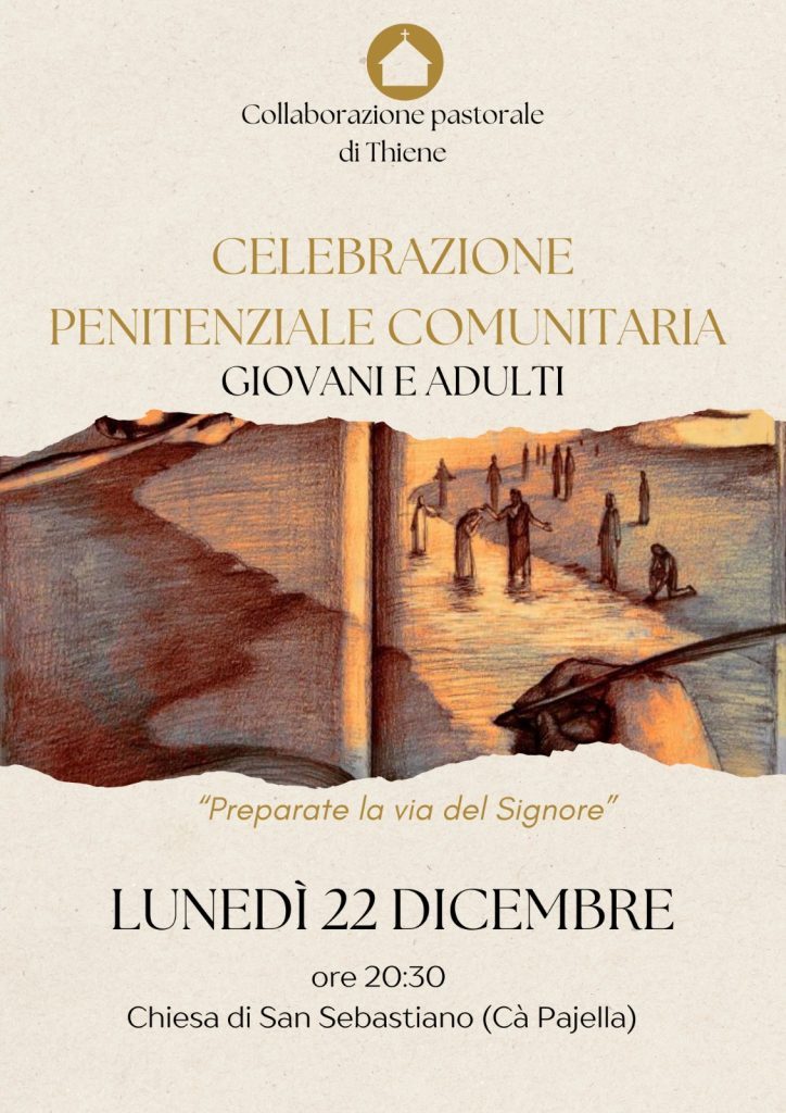 La Collaborazione pastorale di Thiene invita giovani e adulti alla Celebrazione Penitenziale Comunitaria che si terrà LUNEDI’ 22 dicembre alle ore 20:30 presso la Chiesa di San Sebastiano (Cà Pajella).