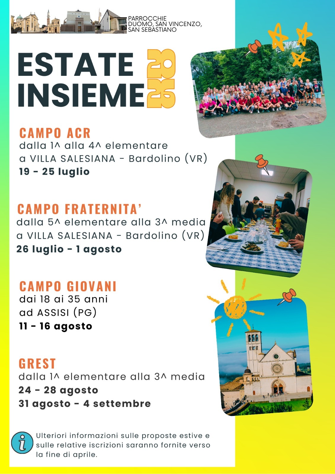 Le nostre tre comunità del Duomo, San Vincenzo e San Sebastiano si uniscono per un’estate indimenticabile! Dalle rive del Garda alla spiritualità di Assisi, ecco il calendario ufficiale delle proposte per ragazzi, giovanissimi e giovani.