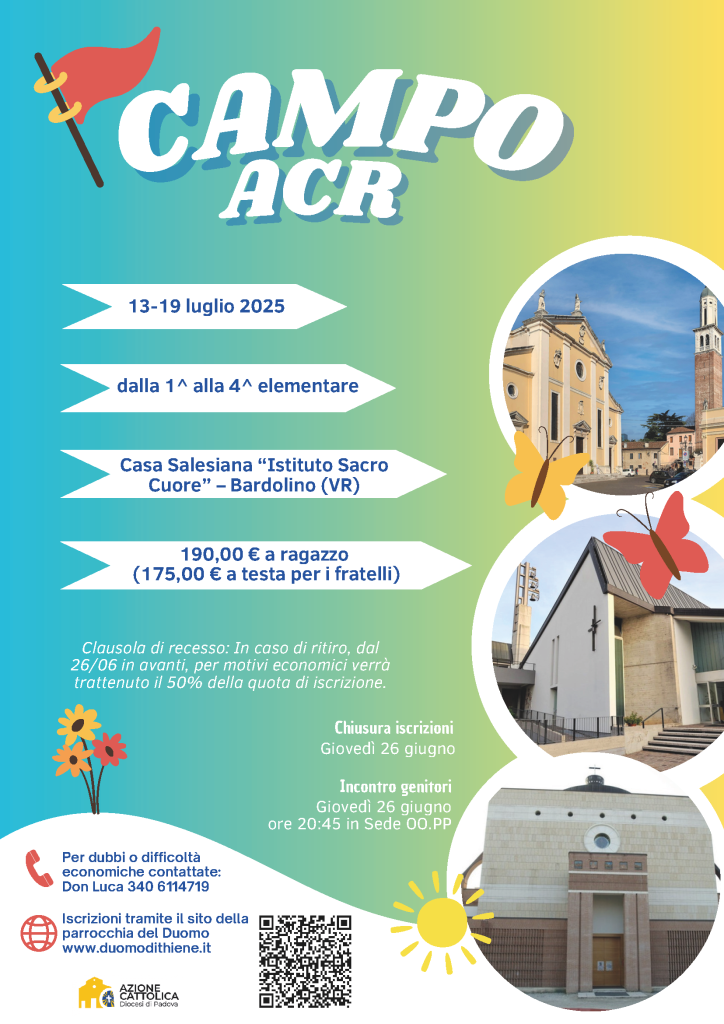 Dal 13 al 19 luglio, presso l’Istituto Salesiano di Bardolino (VR), si è svolto il Campo Scuola ACR, dedicato ai bambini dalla 1ª alla 4ª elementare. Questa esperienza ha segnato il primo appuntamento dell’ESTATE INSIEME 2025, che ha coinvolto i più piccoli delle tre parrocchie del Duomo, San Vincenzo e San Sebastiano.